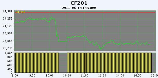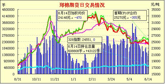 6月14日,鄭棉CF1109合約平開盤整,午前在多頭平倉(cāng)的壓制下走低,午后盤整震蕩,尾盤小幅反彈,日線形成陰線星,日內(nèi)成交量萎縮,持倉(cāng)量變化不大;鄭棉CF1201合約早盤在多頭支撐下盤升,午前空頭打壓期價(jià)增倉(cāng)下滑,午后低位增量盤整,尾盤在少量空頭回補(bǔ)的支撐下反彈,日線形成小陰線,日內(nèi)成交量溫和放大,持倉(cāng)量增加。CF1109合約日成交214682手,日增倉(cāng)302手,終盤持倉(cāng)量249772手;CF1201合約日成交1390132手,日增倉(cāng)43326手,終盤持倉(cāng)量324220手?;久媲闆r:現(xiàn)貨報(bào)價(jià)微跌,低等級(jí)的棉花還是滯銷的,高馬值、高等級(jí)的皮棉報(bào)價(jià)堅(jiān)挺;現(xiàn)貨上價(jià)格便宜的相對(duì)好買,貴的無(wú)人問(wèn)津,結(jié)算方面賒銷的好買,現(xiàn)款的“難尋”。紡織廠繼續(xù)壓縮皮棉庫(kù)存,還是在一點(diǎn)一點(diǎn)的采購(gòu),紗線價(jià)格仍在下跌,企業(yè)虧損出售,停機(jī)限產(chǎn)改紡的極多,目前紗線價(jià)格難言回暖之勢(shì)。今日電子盤大幅下跌, 之前得以恢復(fù)的心態(tài)可能再次面臨改變。國(guó)際方面印度據(jù)印度本土棉商透露,印度政府決定增加100萬(wàn)包(17萬(wàn)噸)棉花出口。