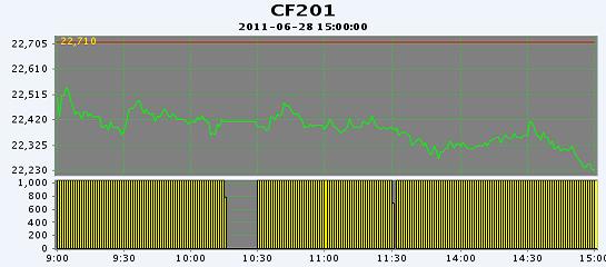 6月28日,鄭棉主要合約小幅高開,CF1109合約在多頭平倉盤壓制下盤跌,尾盤多頭減倉量增大,期價隨之跳水收低,日線形成陰線,日內(nèi)成交量萎縮,持倉量大幅下降;CF1201合約高開后在空頭賣盤壓制下走低,盤中橫向整理,午后重心下移收弱,日線形成陰線,主要合約成交量變化不大,持倉量增加。CF1109合約日成交126598手,日減倉7570手,終盤持倉量178596手;CF1201合約日成交1338606手,日增倉22294手,終盤持倉量379972手?;久媲闆r:現(xiàn)貨價格繼續(xù)下跌,市場成交無望,市場上報價有些混亂,新疆棉報價各有不同,區(qū)別主要是馬值,高質(zhì)量的棉花叫價還是很高,地產(chǎn)棉河南地區(qū)棉花報價22000-23000元/噸。大廠紗線價格繼續(xù)下跌,企業(yè)繼續(xù)走在去庫存的道路上,中小型紡織廠能不買棉花就不買,有的是減產(chǎn)、限產(chǎn)、停產(chǎn)都不買棉花,棉花企業(yè)只能干著急。臨近月底,棉花企業(yè)還貸的壓力越來越大,之前一些企業(yè)不想賣,想辦法找錢還,現(xiàn)在是想辦法賣,但沒辦法只能找錢還。