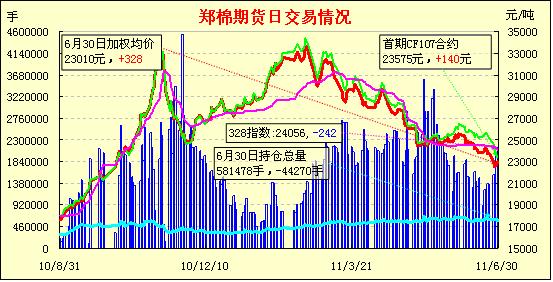6月30日,鄭棉CF1109合約平開增倉上行,盤中高位震蕩減倉整理,日線形成小陽線,日內(nèi)成交量較前一日減少,持倉量下降;CF1201合約高開后增倉回穩(wěn),隨后空頭回補盤支撐期價走高,午后高位減倉回落,日線形成陽線,主要合約成交量萎縮,持倉少量減少。CF1109合約日成交337454手,日減倉16564手,終盤持倉量165874手;CF1201合約日成交1272632手,日減倉36682手,終盤持倉量350228手。基本面情況:現(xiàn)貨成交極少,有棉商開始恐慌性的拋售手中的棉花,低等級棉無人問津,高等級棉銷售尚可價格稍穩(wěn)。期貨市場的倉單棉現(xiàn)貨接手的不多,電子盤連續(xù)兩日大幅下探,市場上多頭退去。紡織廠依舊不好過,一些想拿貨的廠不能給現(xiàn)金,而想賣的棉花企業(yè)都是要拿著錢去還農(nóng)發(fā)行的貸款,所以成交極少。有大型紡織廠也出現(xiàn)了放假的情況,近一段時間以來紡織廠去庫存化的情況并不理想,目前紡織廠庫存天數(shù)相當于金融危機時候的庫存。