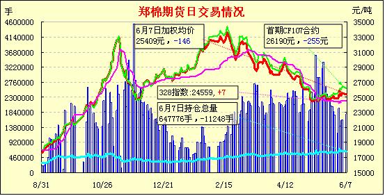 6月7日,端午節(jié)期間紐期沖高回落,影響今日鄭棉CF1109合約低開,早盤下探后在多頭買盤支撐下回升,午間多頭平倉壓制期價下滑盤整,尾盤在空頭回補的支撐下反彈,日線形成低開小陰線,日內(nèi)成交量變化不大,持倉量減少;鄭棉CF1201合約早盤在多頭逢低買盤推動下沖高盤整,盤中高位換后增量后下滑,午后區(qū)間震蕩,日線形成低開陰線旺,日內(nèi)成交量放大,持倉量增加。CF1109合約日成交562580手,日減倉18658手,終盤持倉量338520手;CF1201合約日成交1219408手,日增倉7536手,終盤持倉量275088手?;久媲闆r:現(xiàn)貨市場成交出現(xiàn)了一些小變化,一些小廠繼續(xù)在降價銷售,為了能銷售皮棉可謂是到處奔波;而有一部分廠面對近期電子盤的上漲和現(xiàn)貨上面的少量采購,銷售由之前的積極轉(zhuǎn)為觀望,只對那些老客戶有所成交,但是那些等級低的地產(chǎn)棉依舊很難有銷售。端午小長假來臨,紡織企業(yè)依舊對后市不看好,庫存壓力以及資金壓力依然較大,多選擇放假。