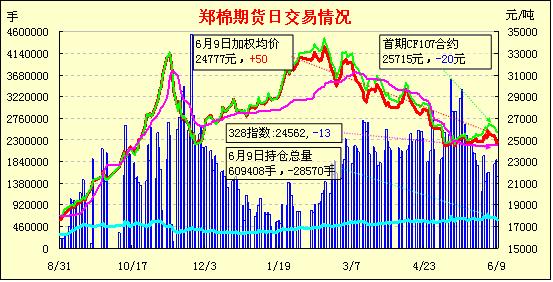 6月9日,鄭棉CF1109合約小幅高開,早盤慣性沖高后在多頭平倉盤打壓下走低,隨后反彈震蕩,尾盤再度受到平倉盤壓制收弱,日線形成小陰線,日內(nèi)成交量萎縮,持倉量大幅減少;鄭棉CF1201合約早盤沖高回落,此后區(qū)間震蕩,午后在多頭集中平倉盤打壓下走低,日線形成1/2上影線的小陰線,日內(nèi)成交量萎縮,持倉量減少。CF1109合約日成交282686手,日減倉22184手,終盤持倉量297146手;CF1201合約日成交1233230手,日減倉6646手,終盤持倉量276482手?;久媲闆r:紗線市場的價格還是在下降,寧波32S普梳高配報33000元/噸---32000元/噸,棉花價格因為這兩天國內(nèi)外電子盤的下跌再次出現(xiàn)了恐慌,可見恢復的信心依舊脆弱,棉花企業(yè)使足了勁銷售棉花,價格還算合適,但下游銷售不旺很難促進棉花的量價回升。從港口了解到的情況,近期港口到貨陸續(xù)增加,銷售壓力可想而知。中小紡織企業(yè)的資金周轉(zhuǎn)苦難,放假是越來越多的中小企業(yè)的“首選”。