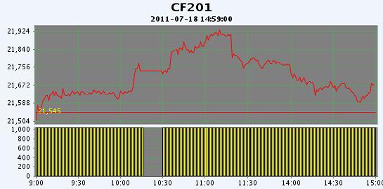 7月18日,鄭棉主要合約低開(kāi),CF1109合約受空頭回補(bǔ)支撐反彈沖高,午后在多頭平倉(cāng)打壓下調(diào)整,日線形成低開(kāi)小陽(yáng)線,日內(nèi)成交量萎縮,持倉(cāng)量減少;CF1201合約在多頭買(mǎi)盤(pán)支撐下回升盤(pán)整,隨后增倉(cāng)加速上行,午后換手量增大,期價(jià)下滑盤(pán)跌,尾盤(pán)受到短線空頭回補(bǔ)支撐反彈,日線形成低開(kāi)1/2上影線的陽(yáng)線,日內(nèi)成交量溫和放大,持倉(cāng)量增加。CF1109合約日成交40942手,日減倉(cāng)5400手,終盤(pán)持倉(cāng)量69030手;CF1201合約日成交1848996手,日增倉(cāng)63874手,終盤(pán)持倉(cāng)量636254手?;久媲闆r:現(xiàn)貨行情依舊不佳,中國(guó)棉花價(jià)格指數(shù)大幅下調(diào),主要是受到山東魏橋的大幅調(diào)價(jià)后,市場(chǎng)恐慌心理進(jìn)一步加劇,甩貨降價(jià)幅度加大,尤其是四級(jí)棉的報(bào)價(jià),大部分有貨的棉花企業(yè)正經(jīng)歷著大面積的虧損,另市場(chǎng)上高等級(jí)高馬值的棉花還是有人要的。據(jù)湖北調(diào)研顯示,當(dāng)?shù)?a href='http://m.qdhqly.cn/News/Channel/?CID=31' title='更多棉花信息' target='_blank'>棉花長(zhǎng)勢(shì)良好,面積增加幅度較大,部分地區(qū)新花有望在8月份上市。