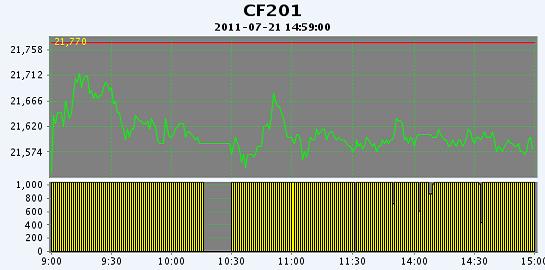 7月21日,鄭棉主要合約平開(kāi),CF1109合約在空頭回補(bǔ)支撐下反彈后增倉(cāng)下落,隨后在空頭回補(bǔ)支撐下盤升,日線陽(yáng)線星,日內(nèi)成交量放大,持倉(cāng)量繼續(xù)減少;CF1201合約早盤反彈后在空頭打壓下走低,隨后盤整減倉(cāng),日線形成陰線星,日內(nèi)成交量萎縮,持倉(cāng)量減少。CF1109合約日成交48768手,日減倉(cāng)3970手,終盤持倉(cāng)量53672手;CF1201合約日成交125840手,日減倉(cāng)25720手,終盤持倉(cāng)量619318手?;久媲闆r:現(xiàn)貨市場(chǎng)價(jià)格大幅下跌,企業(yè)都在拋售,目前值得關(guān)注的是一些企業(yè)在銀行的質(zhì)押業(yè)務(wù),由于還款不利,可能最后導(dǎo)致銀行將棉花拍賣來(lái)收回貸款,這樣的話棉花拍賣的價(jià)格會(huì)低于市價(jià),將會(huì)帶動(dòng)整個(gè)市場(chǎng)現(xiàn)貨行情繼續(xù)下行。下游紗線繼續(xù)在去庫(kù)存,從新訂單的情況上反映,訂單多是混紡的,而且都小、短、散、看上去多,但是累計(jì)量不多。目前部分地區(qū)弱三級(jí)和四級(jí)棉的報(bào)價(jià)已經(jīng)低于國(guó)家的臨時(shí)收儲(chǔ)定價(jià),由于質(zhì)量偏低,采購(gòu)并不多,所以目前看來(lái)后市仍然有下跌的跡象。
