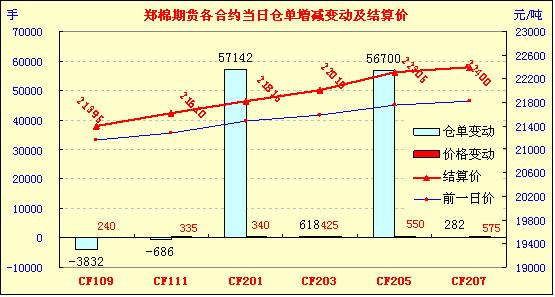 7月27日,鄭棉主要合約早盤全線高開,CF1109合約在空頭回補(bǔ)支撐下走高,午后受到平倉盤壓制下滑,日線形成高開小陽線,日內(nèi)成交量放大,持倉量繼續(xù)減少;CF1201合約早盤在多頭買盤推動下走高,午后調(diào)整震蕩,尾盤在短線回補(bǔ)支撐下反彈,日線形成高開小陽線,日內(nèi)成交量放大,持倉量增加。CF1109合約日成交14190手,日減倉3832手,終盤持倉量43596手;CF1201合約日成交1313978手,日增倉57142手,終盤持倉量655754手。