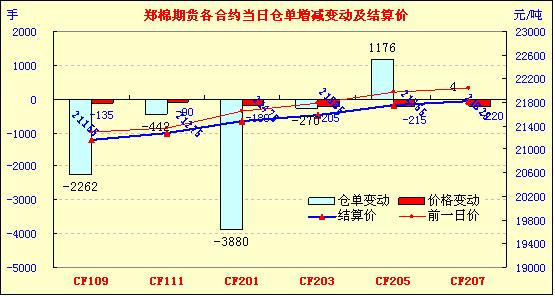 7月26日,鄭棉CF1109合約早盤(pán)在多頭平倉(cāng)的打壓下走低,隨后受到空頭回補(bǔ)支撐反彈,盤(pán)中橫向整理,尾盤(pán)收弱,日線形成小陰線,日內(nèi)成交量萎縮,持倉(cāng)量繼續(xù)減少;CF1201合約早盤(pán)在空頭賣盤(pán)打壓下走低,隨后空頭回補(bǔ)支撐期價(jià)反抽,盤(pán)中橫向整理?yè)Q手,日線形成陰線星,日內(nèi)成交量微幅放大,持倉(cāng)量減少。CF1109合約日成交13662手,日減倉(cāng)2262,終盤(pán)持倉(cāng)量47428手;CF1201合約日成交1191618手,日減倉(cāng)2880手,終盤(pán)持倉(cāng)量598612手。