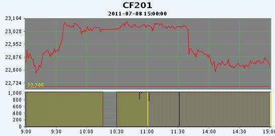7月8日,鄭棉主要合約全線小幅高開,CF1109合約調(diào)整后回升整理,午后多頭增量平倉打壓期價下滑,隨后橫向震蕩,日線形成小陰線,日內(nèi)成交量萎縮,持倉量下降;CF1201合約早盤在多頭買盤推動下沖高震蕩,午后多頭平倉盤壓制期價下滑整理,日線形成長上影線的陽線星,日內(nèi)成交量較前一日下滑,持倉量微增。CF1109合約日成交142720手,日減倉8216手,終盤持倉量120820手;CF1201合約日成交1586346手,日減倉3918手,終盤持倉量518448手?;久媲闆r:棉價繼續(xù)下跌,紡織企業(yè)仍無采購計(jì)劃,現(xiàn)貨上甩貨的企業(yè)到處都是,但是就是沒人買,國際上巴基斯坦國內(nèi)新花上市一周已經(jīng)跌破一美元,國內(nèi)外市場上看空的情緒增加,國內(nèi)棉花價格跌破兩萬的看法也越來越多。由于部分棉花企業(yè)在倉庫有質(zhì)押貸款,在棉花價格日益走低的情況下,銀行催還貸款壓力增加,棉花報(bào)價也比較混亂,更加刺激了市場價格下降的速度。 主力CF201合約當(dāng)日交易走勢
