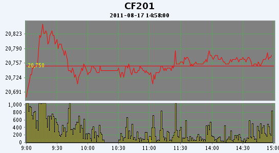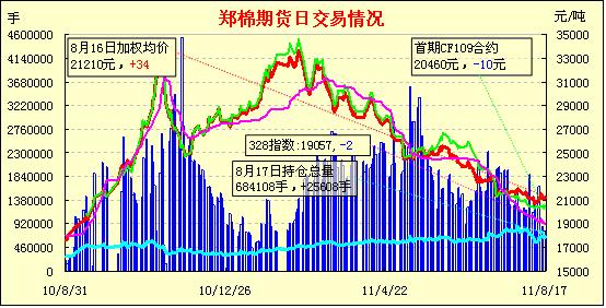 8月17日,鄭棉主要合約早盤高開,CF1201合約早盤沖高回落盤整,午后空頭回補支撐期價小幅反彈,日線形成小陽線,日內(nèi)成交量萎縮,持倉量減少;CF1205合約早盤在多頭買盤推動下沖高,隨后受平倉盤打壓下滑盤整,午后在空頭回補的支撐下反彈,日線形成小陽線,日內(nèi)成交量萎縮,持倉量增加。CF1201合約日成交71756手,日減倉2124手,終盤持倉量259878手;CF1205合約日成交663438手,日增倉29052手,終盤持倉量405064手?;久媲闆r:隨著紡織企業(yè)少量采購,棉花企業(yè)銷售情況所有好轉。另外,棉紗受現(xiàn)貨帶動成交有所走量,價格較昨日持平。外銷訂單沒有需求,內(nèi)銷部分內(nèi)衣廠有嘗試性訂單需求。隨著市場新棉陸續(xù)零星采摘,企業(yè)收購掛牌價均低于棉農(nóng)預期,棉農(nóng)基本不交售籽棉。當前新疆正三級毛重20600-20800元/噸,地產(chǎn)四級18000元/噸左右;期貨倉單棉19500-19700元/噸,均已低于政策底價。進口棉由于品質不同19000-20300元不等,澳棉高馬值20600-20900元不等。
