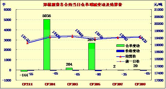 今日鄭棉平開震蕩,持倉量增加。CF1301開盤價19400元/噸,最高價19485元/噸,最低價19360噸,收盤價19435元/噸,持平;日成交量為61522手;持倉量增加,日增倉5036手至224336手。CF1305收于19305元/噸,跌15元/噸;日成交量為23174手;持倉量增2674至122524手。11日,美國農業(yè)部公布的棉花供需預測報告利空,使得紐約期棉下跌,近期12月合約收于70.71美分/磅,跌139點,3月合約收于71.40美分,跌162點。國外市場雖然跌幅較大,但是國內市場反應平淡,預計后期還是以震蕩為主。10月11日,計劃收儲99600噸,實際成交58720噸,成交比例59%。其中,新疆庫點計劃收儲45000噸,實際成交44800噸,成交比例99.5%;內地庫計劃收儲45600噸,實際成交13920噸,成交率31%。截止11日2012年度棉花臨時收儲累計成交669290噸,新疆累計成交546320噸,內地累計成交122970噸。美國農業(yè)部公布10月份供需報告,整個供需報告仍然偏空。2012//13年度上調全球產(chǎn)量50.03萬噸至2532.07萬噸,其中美國略調增3.88萬噸至376.39萬噸,印度調增21.77萬噸至555.21萬噸,中國調增10.89萬噸至685.84萬噸;貿易量略有調減,進出口分別調減2.94萬噸和3.16萬噸至793.86萬噸和793.82萬噸,其中,中國進口量大幅調減,調減21.77萬噸至239.50萬噸,其他國家變化不大;消費量調減14.81萬噸至2326.92萬噸,其中中國調減43.55萬噸至783.82萬噸,印度調增10.89萬噸至479萬噸;全球期末庫存量調增56.46萬噸至1722.51萬噸,中國庫存量為797.02萬噸,調增23.95萬噸,印度調減11.98萬噸至189.95萬噸,美國調增6.53萬噸至122.93萬噸,巴西調增11.98萬噸,澳大利亞調增1.26萬噸。