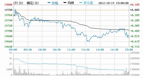 10月19日低開(kāi)下跌,多單回吐。今日主要合約低開(kāi),午前在多頭平倉(cāng)壓制下盤整,午后在空頭回補(bǔ)推動(dòng)下反彈脫離低點(diǎn),日線形成低開(kāi)小陰線,主力合約成交量萎縮,持倉(cāng)量減少。CF1301合約日成交62328手,日減倉(cāng)13524手,終盤持倉(cāng)量187168手;CF1305合約日成交39452手,日減倉(cāng)2396手,終盤持倉(cāng)量121418手?;久媲闆r:十月下旬以來(lái),各棉區(qū)籽棉采收進(jìn)度有所加快,但棉副產(chǎn)品行情較為疲軟,尤其是棉籽價(jià)格不斷下跌,給棉花企業(yè)經(jīng)營(yíng)帶來(lái)較大壓力,部分原本打算囤積棉籽的棉企對(duì)后市持悲觀態(tài)度,也就順應(yīng)行情進(jìn)行了銷售。新疆方面,交儲(chǔ)競(jìng)拍日趨激烈,甚至有部分軋花廠已連續(xù)一周多沒(méi)有競(jìng)拍成功。下游方面,全棉紗略有價(jià)格上的微調(diào),低配氣流紡紗價(jià)格讓利。