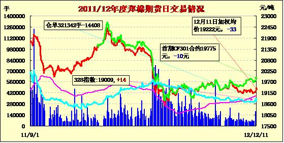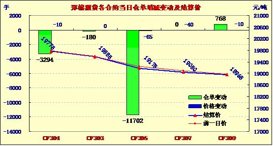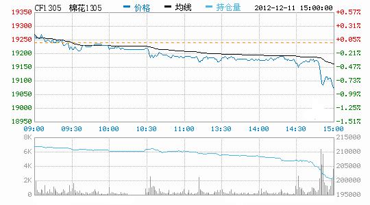 12月1日鄭棉1305合約高開低走,收一中大陰K線,開盤報(bào)19275元/噸,收盤于19075元/噸,較前一交易日下跌165元/噸,最高價(jià)19280元/噸,最低價(jià)19065元/噸。成交量減少為114356手,持倉量減少11702手至201262手。