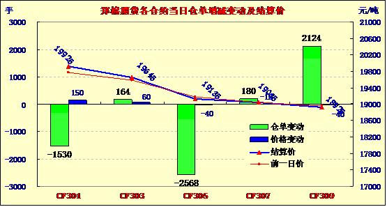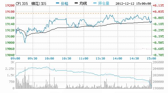 12月1日鄭棉1305合約高開低走,收一中大陰K線,開盤報(bào)19275元/噸,收盤于19075元/噸,較前一交易日下跌165元/噸,最高價(jià)19280元/噸,最低價(jià)19065元/噸。成交量減少為114356手,持倉(cāng)量減少11702手至201262手。