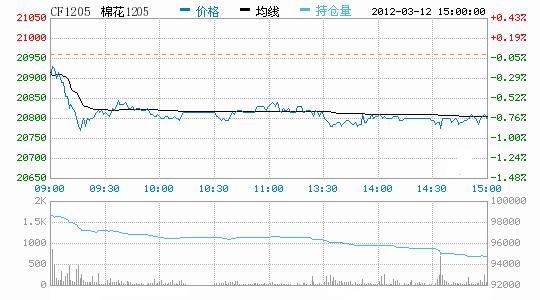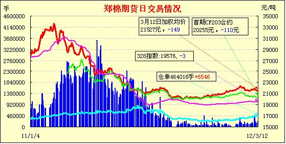 3月12日,鄭棉主要合約低開,早盤在空頭賣盤打壓下走低,此后低位震蕩,日線形成陽線,主要合約成交量放大,持倉量近減遠增。CF1205合約日成交15972手,日減倉3938手,終盤持倉量94778手;CF1209合約日成交199694手,日增倉9768手,終盤持倉量315196手?;久媲闆r:皮棉銷售價格仍小幅下跌,成交清淡。400型棉花企業(yè)為了在交儲上獲取收益,便加緊了籽棉收購步伐。據(jù)了解,部分地區(qū)棉企目前籽棉存量不大,按照目前的收購進度,如果停止籽棉收購,只需要2—3天即可全部加工完畢,因此籽棉收購工作即使持續(xù)至月底,依然能將合格皮棉全部入儲。棉副方面,受今日外圍油脂大漲支撐,棉油價格保持穩(wěn)定,優(yōu)勢較為明顯;個別地區(qū)棉籽價格持續(xù)上漲,油廠采購略有好轉(zhuǎn)。下游方面,國內(nèi)紗線市場行情極為低迷,市場成交阻力明顯,成交量處于較低水平,市場報價難以支撐,市場心態(tài)不佳。
