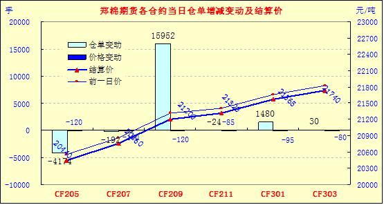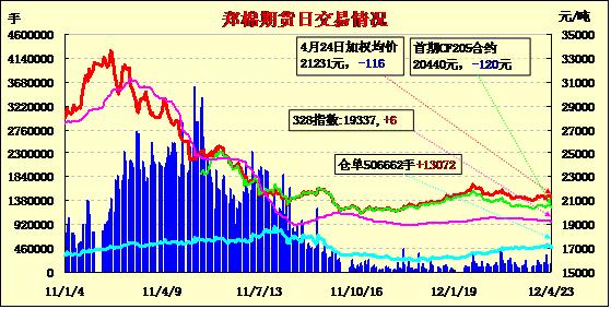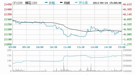 4月24日,鄭棉CF1209合約小幅低開,早盤在空頭賣盤打壓下回落盤整,午間空頭增量打壓期價下滑,午后在空頭回補與多頭買盤支撐下脫離低點反彈,日線形成陰線,主要合約成交量溫和放大,持倉量增加。CF1205合約日成交6072手,日減倉4174手,終盤持倉量24058手;CF1209合約日成交178954手,日減倉15952手,終盤持倉量369928手?;久媲闆r:市面上的籽棉資源日趨緊張,市場行情仍無回暖跡象,現(xiàn)貨成交清淡。據(jù)了解,受農(nóng)發(fā)行催貸的影響,近日在新疆疆內(nèi)和內(nèi)地倉庫都有棉企低價售棉的現(xiàn)象,比市場價格低200-300元/噸出貨,但要求采購企業(yè)每一筆訂單不能少于100噸,且必須是全款提貨。棉副方面,今日棉副市場整體保持穩(wěn)定,棉短絨、棉殼需求一般。下游方面,紗線價格疲軟依舊,成交還受到進口紗沖擊,廠家采購棉花意愿仍較平淡。