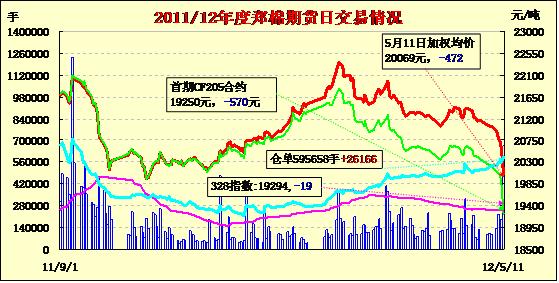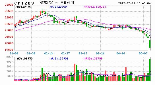 5月11日,紐期收跌停,影響今日鄭棉CF1209合約低開,盤中在空頭賣盤打壓下增量下行,午后觸及跌停,隨后盤面大量減倉,終盤回落至跌停價位,日線形成長陰線,主要合約成交量放大,持倉量先增后減。CF1209合約日成交452228手,日減倉7442手,終盤持倉量390762手;CF1301合約日成交200522手,日增倉22580手,終盤持倉量131880手?;久媲闆r:部分企業(yè)已經(jīng)陸續(xù)接到滑準(zhǔn)稅進口配額的通知,并且知道了數(shù)量,最快的下周可以去打證。今日兩盤延續(xù)較大跌幅,棉花弱勢仍然明顯。部分棉企出售意向較為積極,但因為紡織企業(yè)青睞外棉,成交基本停滯。棉副方面,油廠家停機率上升,進一步壓制了棉籽銷售價格;外圍不佳,棉油暫時難尋支撐。下游方面,全棉紗行情穩(wěn)定,個別商戶還有討價還價的現(xiàn)象,不過讓利幅度較小,成交批量沒有改觀。