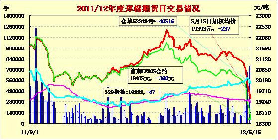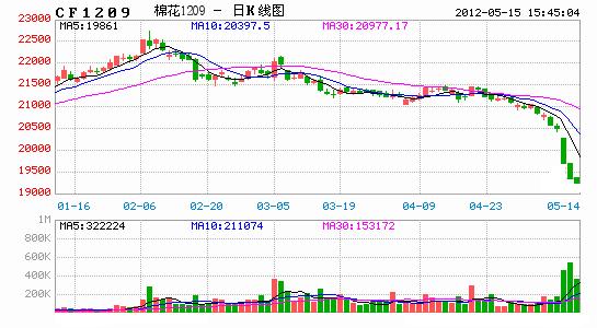 5月月15日,鄭棉CF1209合約微幅高開,早盤下探后在空頭回補(bǔ)支撐下反彈震蕩,隨后在空頭賣盤壓制下走低,午后弱市盤整,尾盤在空頭集中回補(bǔ)支撐下反彈,日線形成1/2下影線的陰線,主要合約成交量萎縮,近期合約持倉量大幅減少,遠(yuǎn)期合約持倉量增加。CF1209合約日成交351824手,日減倉15208手,終盤持倉量317660手;CF1301合約日成交140598手,日增倉6840手,終盤持倉量166710手。因電子盤大幅下跌,市場氣氛緊張,棉花價(jià)格不僅僅自2010年9月17日以來最低,而且跌到國家收儲(chǔ)價(jià)格19800元以下,相當(dāng)于跌回兩年前水平。現(xiàn)貨成交更加冷清,加工企業(yè)對(duì)后市較為悲觀,有庫存的不惜虧本加緊拋售,以防棉價(jià)繼續(xù)下跌。棉副方面,在外圍油脂粕類行情走低的影響下,棉油、粕行情疲軟。下游方面,全棉紗價(jià)格報(bào)平,市場交易沒有變化,低價(jià)無稅票紗占主流,不少紗線暗中含滌短,內(nèi)銷家紡面料需用滌短報(bào)價(jià)維持,市場走貨不快。