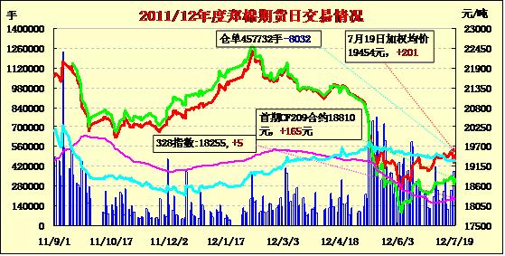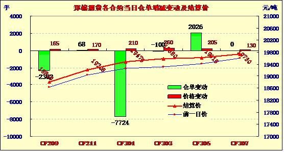 7月19日,鄭棉CF1301合約高開,早盤橫向整理,午間一度調(diào)整,午后在空頭集中回補支撐下回升,尾盤走強,日線形成小陽線,日內(nèi)成交量萎縮,持倉量減少。CF1301合約日成交142376手,日減倉7724手,終盤持倉量291710手;CF1305合約日成交11528手,日增倉2026手,終盤持倉量69326手?;久媲闆r:隨著新年度的臨近,部分企業(yè)已經(jīng)籌集到了資金,并完成了在新疆包廠收購的包場手續(xù),以備更好地收購新棉。棉副方面,棉副產(chǎn)品行情暫時維穩(wěn),外圍行情回調(diào)使得棉油、粕報價上調(diào)受到一定影響;棉短絨仍以弱勢為主。