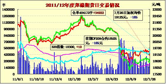 7月26日,鄭棉CF1301合約低開,早盤反彈后受空頭賣盤壓制下滑,隨后橫向整理,尾盤在空頭回補支撐下反彈,日線形成陰線星,日內(nèi)成交量放大,持倉量大幅增加。CF1301合約日成交249072手,日增倉38896手,終盤持倉量335038手;CF1305合約日成交23056手,日減倉840手,終盤持倉量71918手。基本面情況:受國際經(jīng)濟環(huán)境再度轉(zhuǎn)弱,大宗商品整體回落,市場避險情緒增加等因素影響,今日電子盤跌幅較大,但對現(xiàn)貨市場影響有限,皮棉價格保持穩(wěn)定,成交依然冷清。棉副方面,市場上棉副產(chǎn)品因貨源稀少支撐,行情波動有限,棉油表現(xiàn)轉(zhuǎn)弱,棉粕表現(xiàn)仍堅挺,棉短絨、棉殼行情尚可。下游方面,棉紗市場整體運行平穩(wěn),雖詢價略有增多,但市場成交較少,各紗廠仍以消化庫存為主,個別廠家有小單成交。