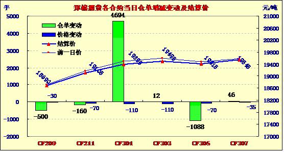 8月27日,鄭棉CF1301合約小幅低開,早盤橫盤整理,午后在空頭賣盤打壓下走低,尾盤反彈,日線形成陰線,日內(nèi)成交量萎縮,持倉量增加。CF1301合約日成交146298手,日增倉4694手,終盤持倉量278010手;CF1305合約日成交14270手,日減倉1088手,終盤持倉量85002手?;久媲闆r:近兩日全國大部棉區(qū)天氣良好,對棉花結(jié)鈴、吐絮較為有利,目前大部棉花長勢良好。據(jù)悉,目前多數(shù)大廠已經(jīng)準(zhǔn)備完畢,對新棉收購信心十足;但小廠信心明顯不足,表示視市場情況再決定是否收購加工,有的則表示只收購不加工,將籽棉賣給400型企業(yè)。棉副方面,棉油、粕近日漲價后稍有調(diào)整,棉短絨價格穩(wěn)中有漲,棉殼高位稍有回落,各產(chǎn)品漲跌幅度均有限。