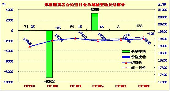 9月28日,鄭棉CF1301合約高開,早盤下滑后于低位成交放量,隨后在空頭回補(bǔ)推動下震蕩走高,日線形成長下影線的陽線,日內(nèi)主力合約成交量放大,持倉量減少。CF1301合約日成交142814手,日減倉9106手,終盤持倉量209306手;CF1305合約日成交38204手,日增倉3298手,終盤持倉量110758手?;久媲闆r:現(xiàn)貨價格漲勢放緩,部分地區(qū)有所停滯,棉市行情仍然呈現(xiàn)弱勢。據(jù)悉,目前山東地區(qū)加工出來的皮棉幾乎沒有三級的,大多數(shù)以四級為主,但據(jù)加工企業(yè)反映,收購成本過高,部分地區(qū)甚至達(dá)到20200元/噸,高于四級棉的收儲價格近400元,所以部分企業(yè)停止暫時停止收購工作,市場觀望情緒較濃。棉副方面,市場上棉副產(chǎn)品跌勢不止,外圍油脂、粕類支撐力喪失,棉油、粕跌幅有擴(kuò)大趨勢,需求不振。