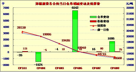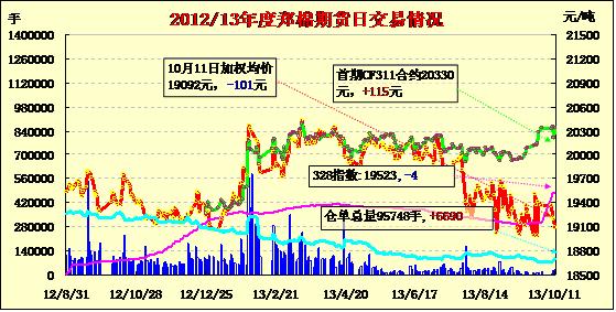 10月11日,鄭棉CF1401合約平開(kāi),盤(pán)中窄幅盤(pán)整,日線形成陽(yáng)線星,日內(nèi)成交量變化不大,持倉(cāng)量減少。CF1401合約日成交5268手,日減倉(cāng)1524手,終盤(pán)持倉(cāng)量42052手;CF1405合約日成交24352手,日增倉(cāng)6542手,終盤(pán)持倉(cāng)量45504手?;久媲闆r:日前,南疆棉企收購(gòu)籽棉價(jià)在9.3-9.7元/公斤,衣分高價(jià)格則高。北疆棉企收購(gòu)價(jià)在8.8-9.3元/公斤。目前企業(yè)收購(gòu)難以上量,造成部分企業(yè)不得不提價(jià)收購(gòu)。近日,新疆各企業(yè)已經(jīng)陸續(xù)庫(kù)存了部分已經(jīng)加工出的皮棉,大部分剛開(kāi)始競(jìng)拍,幾乎沒(méi)有現(xiàn)貨銷(xiāo)售,只有部分無(wú)條碼企業(yè)賣(mài)給交儲(chǔ)企業(yè),三級(jí)報(bào)價(jià)19850元/噸。據(jù)企業(yè)反饋,目前阿克蘇地區(qū)交儲(chǔ)競(jìng)拍難度較大,一家企業(yè)連續(xù)競(jìng)拍了五天還沒(méi)有競(jìng)拍到。