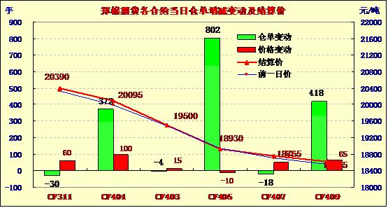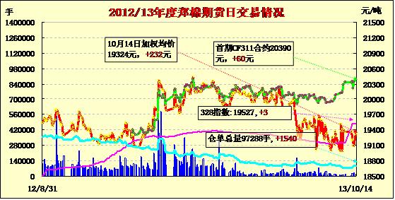 10月14日,鄭棉CF1401合約高開,隨后增倉調(diào)整,日線形成高開陰線,日內(nèi)成交量萎縮,持倉量增加;CF1405合約小幅高開,盤中在多頭買盤推動下走高,尾盤受短線平倉壓制回落,日線形成陽線星,日內(nèi)成交量萎縮,持倉量增加。CF1401合約日成交4246手,日增倉372手,終盤持倉量42424手;CF1405合約日成交7072手,日增倉802手,終盤持倉量46306手。