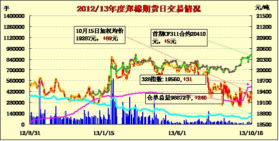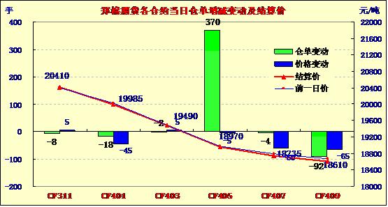 10月16日,鄭棉CF1401合約平開(kāi),早盤(pán)調(diào)整后在空頭回補(bǔ)與多頭買盤(pán)支撐下反彈,日線形成1/2下影線的陰線,日內(nèi)成交量萎縮,持倉(cāng)量變化不大;CF1405合約平開(kāi),早盤(pán)上試后在平倉(cāng)盤(pán)壓制下調(diào)整,日線形成小陰線,日內(nèi)成交量萎縮,持倉(cāng)量增加。CF1401合約日成交3192手,日減倉(cāng)18手,終盤(pán)持倉(cāng)量42036手;CF1405合約日成交5120手,日增倉(cāng)370手,終盤(pán)持倉(cāng)量48190手。