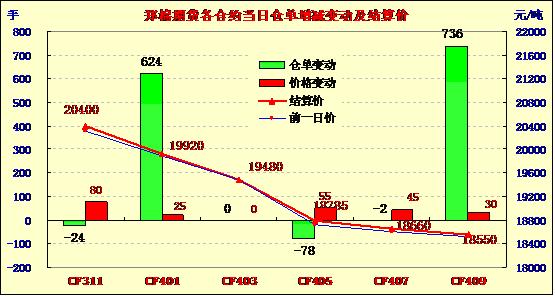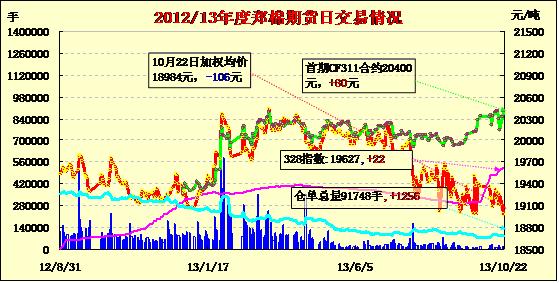 10月22日,鄭棉CF1401合約平開(kāi),盤中在空頭賣盤壓制下盤跌,日線形成小陰線,日內(nèi)成交量萎縮,持倉(cāng)量增加;CF1405合約平開(kāi)盤整,隨后在空頭回補(bǔ)與多頭買盤推動(dòng)下上行震蕩,午后多頭平倉(cāng)盤打壓期價(jià)收低,日線形成星線,日內(nèi)成交量萎縮,持倉(cāng)量變化不大。CF1401合約日成交2736手,日增倉(cāng)624手,終盤持倉(cāng)量38182手;CF1405合約日成交10264手,日減倉(cāng)78手,終盤持倉(cāng)量43990手?;久媲闆r:不少企業(yè)反應(yīng)今年公檢較為嚴(yán)格,不少棉花達(dá)不到收儲(chǔ)標(biāo)準(zhǔn)。國(guó)內(nèi)皮棉市場(chǎng)成交基本處于停滯,紡織企業(yè)在等待拋儲(chǔ)。港口庫(kù)存所剩不多,近期外棉價(jià)格不斷上漲。另外據(jù)反映11月和12月船期訂貨均不錯(cuò)。