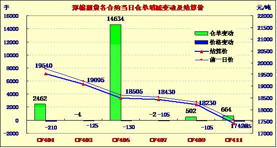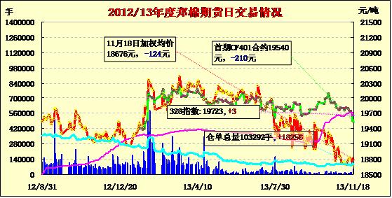 11月18日,鄭棉CF1405合約平開,早盤橫向震蕩,午后在空頭打壓下增倉下跌,盤中一度反彈,尾盤再度受到集中賣盤壓制收低,日線形成陰線,日內(nèi)成交量成倍放大,持倉量大幅增加。CF1401合約日成交9846手,日增倉2462手,終盤持倉量30590手;CF1405合約日成交36404手,日增倉14634手,終盤持倉量62428手?;久媲闆r:近日,河北衡水籽棉市場出現(xiàn)收購價格和收購數(shù)量雙雙上漲態(tài)勢,而且現(xiàn)貨市場也一改往日近乎“零成交”的局面,終現(xiàn)少量成交,其中新疆棉成交狀況好于地產(chǎn)棉。