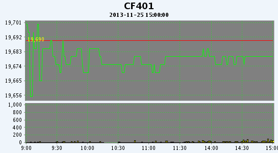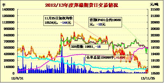11月25日,鄭棉CF1405合約低開,早盤增倉下滑,午后在多頭買盤推動下反彈,尾盤回落收弱,日線形成小陰線,日內(nèi)成交量放大,持倉量增加。CF1401合約日成交2056手,日減倉1862手,終盤持倉量20048手;CF1405合約日成交11308手,日增倉1924手,終盤持倉量66610手。基本面情況:棉紗行情仍舊清淡,市場走貨不佳。近期港口現(xiàn)貨需求有所好轉(zhuǎn),主要是部分企業(yè)庫存偏緊,需求補庫,但整體成交量不大,目前港口現(xiàn)貨所剩不多。