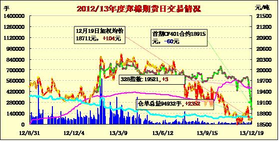 12月19日,鄭棉CF1405合約平開(kāi),早盤(pán)在空頭回補(bǔ)推動(dòng)下回升震蕩,盤(pán)中高位放量換手,尾盤(pán)調(diào)整,日線形成1/3上影線的陽(yáng)線,日內(nèi)成交量成倍放大,持倉(cāng)量減少。CF1405合約日成交34254手,日減倉(cāng)1440手,終盤(pán)持倉(cāng)量64758手;CF1409合約日成交7924手,日增倉(cāng)3042手,終盤(pán)持倉(cāng)量16388手?;久媲闆r:目前各大港口零星到了些美棉、西非棉和印度棉,全國(guó)保稅區(qū)棉花庫(kù)存仍處于較低水平,預(yù)計(jì)1月份中下旬開(kāi)始庫(kù)存能有所增加。