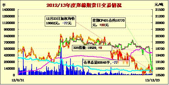 12月23日,鄭棉CF1405合約低開后上行,隨后在多頭平倉打壓下走低,午后區(qū)間整理,尾盤增量收低,日線形成1/2上影線的陰線,日內(nèi)成交量萎縮,持倉量增加。CF1405合約日成交11250手,日增倉242手,終盤持倉量61052手;CF1409合約日成交3378手,日減倉126手,終盤持倉量17854手?;久媲闆r:為將2013年滑準(zhǔn)稅配額使用完,買家習(xí)慣選擇在年底采購12月25日之前到港的棉花,這其中印度棉為主要選擇之一。而今年,由于印度棉推遲上市,一些原本簽訂的合同不得不延續(xù)到1月份到港。近期港口現(xiàn)貨成交略有轉(zhuǎn)好。儲備棉競賣比率仍有下降跡象,企業(yè)競賣謹(jǐn)慎。