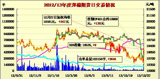 12月27日,鄭棉CF1405合約高開,盤中在多頭買盤支撐下沖高,隨后橫向盤整,日線形成陽線,日內(nèi)成交量成倍放大,持倉量大幅增加。CF1405合約日成交117688手,日增倉3678手,終盤持倉量67242手;CF1409合約日成交15974手,日減倉844手,終盤持倉量18702手?;久媲闆r:元旦、春節(jié)雙節(jié)將至,下游工廠停車放假的數(shù)量不斷增加,拖累紗布市場銷售明顯萎縮,抑制了對棉花的需求。近期,紡織企業(yè)的拍儲熱情明顯不足,主要原因如下:1.由于拍儲的棉花等級不高,無法滿足紡織企業(yè)的生產(chǎn)需求。2.產(chǎn)成品市場疲軟,對棉花的需求不足。3.年終歲尾,假期將至,考慮到安全因素,不敢存大批棉花在庫。4.紡織企業(yè)資金緊張是一個普遍性的問題,所以想把有限的資金用途最大化,比如,采購更能滿足生產(chǎn)需求的棉花、還貸等。