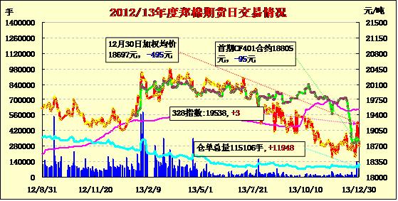 12月30日,鄭棉CF1405合約低開(kāi),早盤(pán)橫向盤(pán)整,隨后在平倉(cāng)盤(pán)壓制走低,此后低位震蕩,午后空頭回補(bǔ)推動(dòng)期價(jià)上揚(yáng),日線形成低開(kāi)陽(yáng)線星,日內(nèi)成交量成倍萎縮,持倉(cāng)量減少。CF1405合約日成交55840手,日減倉(cāng)401手,終盤(pán)持倉(cāng)量63224手;CF1409合約日成交21810手,日增倉(cāng)5886手,終盤(pán)持倉(cāng)量24588手?;久媲闆r:元旦、春節(jié)雙節(jié)將至,下游工廠停車放假的數(shù)量不斷增加,拖累紗布市場(chǎng)銷售明顯萎縮,抑制了對(duì)棉花的需求。近期,紡織企業(yè)的拍儲(chǔ)熱情明顯不足,主要原因如下:1.由于拍儲(chǔ)的棉花等級(jí)不高,無(wú)法滿足紡織企業(yè)的生產(chǎn)需求。2.產(chǎn)成品市場(chǎng)疲軟,對(duì)棉花的需求不足。3.年終歲尾,假期將至,考慮到安全因素,不敢存大批棉花在庫(kù)。4.紡織企業(yè)資金緊張是一個(gè)普遍性的問(wèn)題,所以想把有限的資金用途最大化,比如,采購(gòu)更能滿足生產(chǎn)需求的棉花、還貸等。