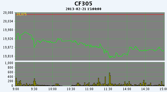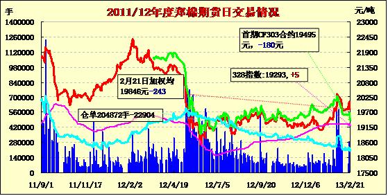 2月21日,鄭棉主要合約小幅低開,盤中在多頭平倉壓制下走低,午后空頭回補(bǔ)支撐期價(jià)反彈,日線形成1/2下影線的陰線,日內(nèi)成交量變化不大,持倉量減少。CF1305合約日成交11524手,日減倉3182手,終盤持倉量37596手;CF1309合約日成交162064手,日減倉19992手,終盤持倉量146836手?;久媲闆r:隨著部分地區(qū)棉企的零星復(fù)工,市面上已有少量皮棉產(chǎn)出,但現(xiàn)貨方面仍鮮有成交,仍以交儲(chǔ)為第一目標(biāo)。棉副方面,棉籽價(jià)格依然堅(jiān)挺;棉油、粕穩(wěn)中略跌;棉短絨繼續(xù)反彈;棉殼穩(wěn)定。下游方面,棉紡市場(chǎng)陸續(xù)恢復(fù),紗線價(jià)格保持,但市場(chǎng)交易批量沒有明顯拓展。