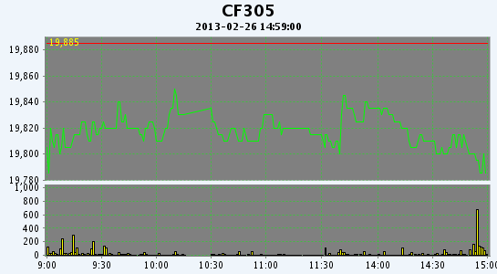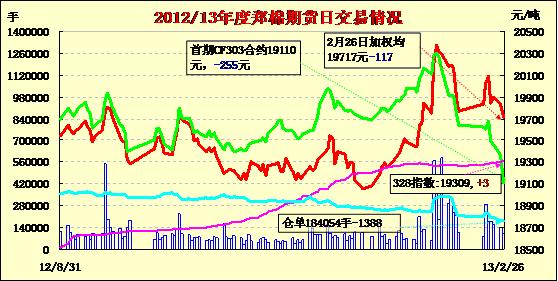 2月26日,鄭棉主要合約低開,早盤橫向盤整,尾盤在多頭平倉(cāng)壓制下收低,日線形成陰線星,日內(nèi)成交量萎縮,持倉(cāng)量變化不大。CF1305合約日成交4976手,日減倉(cāng)1330手,終盤持倉(cāng)量33206手;CF1309合約日成交95736手,日增倉(cāng)566手,終盤持倉(cāng)量131762手。基本面情況:正月十五過(guò)后,開門收購(gòu)的棉花企業(yè)雖然有所增多,由于棉籽價(jià)格仍處高位,部分棉企表示要提價(jià)進(jìn)行籽棉收購(gòu)工作,以期在最后階段獲取更多的籽棉資源。紡織企業(yè)也陸續(xù)恢復(fù)生產(chǎn),但多數(shù)眼光仍在儲(chǔ)備棉投放上面,對(duì)現(xiàn)貨采購(gòu)關(guān)注度不高。