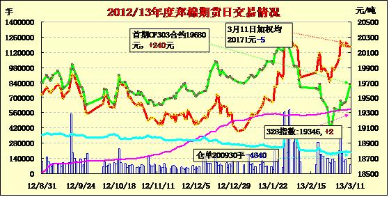 3月11日,鄭棉主要合約小幅低開,盤中在多頭平倉壓制下盤跌,終盤收弱,日線形成小陰線,日內(nèi)成交量萎縮,持倉量減少。CF1305合約日成交1894手,日增倉78手,終盤持倉量25308手;CF1309合約日成交76884手,日減倉4604手,終盤持倉量152378手?;久媲闆r:進入收購加工尾聲后,各地部分棉企仍在收購籽棉進行加工,據(jù)悉一些棉企加工的棉花為春節(jié)前的存貨。棉副方面,各產(chǎn)品價格有止跌趨勢,下游采購尚可。下游方面,由于中國需求的增長,外紗銷售大熱,江浙企業(yè)外紗用量明顯上升,其中印巴棉紗占主流。