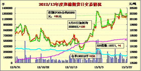 3月27日,鄭棉主要合約平開,早盤慣性上沖后在多頭平倉盤壓制下調(diào)整,午后一度在多頭買盤推動下沖高,但是尾盤再度減倉回落,日線形成小陰線,日內(nèi)成交量變化不大,持倉量增加。CF1309合約日成交87854手,日增倉1190手,終盤持倉量144440手;CF1401合約日成交4146手,日增倉420手,終盤持倉量29808手?;久媲闆r:昨日中國棉花協(xié)會二屆五次理事會暨棉花形勢分析會在湖北武漢召開。會上有關(guān)部門通報國家宏觀調(diào)控政策動向等方面情況,代表將就當前全國棉花產(chǎn)購銷形勢進行交流分析并提出政策建議。據(jù)悉,大多數(shù)棉企目前都關(guān)注下一年度國家的收儲政策,普遍對收儲托市持肯定態(tài)度,部分棉企則對來年收購信心滿滿。
