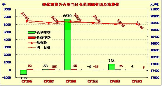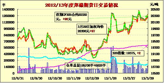 3月29日,鄭棉主要合約低開,早盤增倉上行后盤整,午后在平倉盤壓制下回落震蕩,日線形成低開陽線,日內(nèi)成交量放大,持倉量增加。CF1309合約日成交148130手,日增倉6670手,終盤持倉量148122手;CF1401合約日成交6806手,日增倉734手,終盤持倉量32848手。基本面情況:由于今日為本年度棉花臨時收儲最后一個交易日,為避免交儲違規(guī)情況的發(fā)生,以及盡量避免收儲結(jié)束后現(xiàn)貨難銷帶來的一些風(fēng)險,絕大部分棉企已經(jīng)停止了籽棉收購工作,當前的任務(wù)則是盡快組批、送庫,盡力把最后成交的交儲合同執(zhí)行好。下游方面,全棉紗走量稍有增加,高端紗小幅提價,緊密紡尤為緊俏,紗廠訂單充足,供貨緊張,但整體出貨量稍顯不足。
