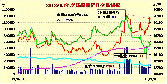 3月6日,鄭棉主要合約高開,早盤在多頭買盤推動(dòng)下沖高,隨后受平倉盤打壓震蕩下滑,午后低位震蕩,日線形成長上影線的陽線星,日內(nèi)成交量萎縮,持倉量增加。CF1305合約日成交4066手,日減倉420手,終盤持倉量26278手;CF1309合約日成交175682手,日增倉2050手,終盤持倉量150798手?;久媲闆r:近日籽棉收購價(jià)格保持穩(wěn)定,部分四級(jí)棉收購價(jià)略有上漲,成交量有所放大?,F(xiàn)貨市場(chǎng)較為冷清,雖價(jià)格略漲,但多有價(jià)無市。棉副方面,各產(chǎn)品受外圍影響,價(jià)格均雖有所回調(diào)。下游方面,由于外銷疲軟,內(nèi)銷不足等原因,雖然紗廠和貿(mào)易商補(bǔ)漲意愿強(qiáng),試探性提高報(bào)價(jià),但實(shí)際成交時(shí)大多執(zhí)行原報(bào)價(jià),只有少數(shù)新訂單執(zhí)行新報(bào)價(jià)。