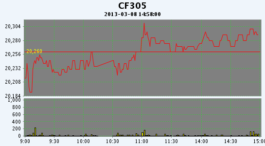 3月8日,鄭棉主要合約低開,早盤調(diào)整后在多頭買盤支撐下反抽,午后增倉上行,重心上移,日線形成陽線,日內(nèi)成交量放大,持倉量增加。CF1305合約日成交2634手,日減倉634手,終盤持倉量25230手;CF1309合約日成交124188手,日增倉7998手,終盤持倉量156982手?;久媲闆r:隨著時間的推移,部分棉企已經(jīng)退市,他們幾乎將合格的皮棉全部交儲,不符合條件的數(shù)量很少,現(xiàn)貨較為難銷。目前市面上高等級資源已經(jīng)較少,開工企業(yè)抓緊時間進行搶收。棉副方面,市場上棉油、粕行情多有小幅回落,而且棉短絨、棉殼近期行情也表現(xiàn)不佳,油廠產(chǎn)品銷售較為困難。下游方面,全棉紗總體行情延續(xù)弱勢,下游需求疲軟,市場成交清淡。目前下游企業(yè)高企的庫存,中間商較為頭疼,拿貨消極。