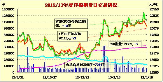 4月16日鄭棉主要合約小幅低開,盤中在空頭持續(xù)回補(bǔ)的支撐下走高,午后盤整,日線形成1/2下影線的陽線,日內(nèi)成交量萎縮,持倉量減少。CF1309合約日成交52976手,日減倉6050手,終盤持倉量117252手;CF1401合約日成交3306手,日減倉406手,終盤持倉量33684手?;久媲闆r:據(jù)調(diào)查,4月10-20日新疆南疆各棉區(qū)進(jìn)入播種高峰期,阿克蘇沙雅、柯坪、庫車等地兵團(tuán)、地方棉花種植進(jìn)度已達(dá)到50%以上,而且今年南疆精量播種普遍達(dá)到60%以上,實(shí)現(xiàn)滴灌的比例也達(dá)到70%以上,既可保證墑情,又可以隨時(shí)實(shí)現(xiàn)灌溉。業(yè)內(nèi)預(yù)計(jì),由于今年南疆升溫比較快,而且至4月中旬前后墑情非常好,4月25日前后播種將臨近尾聲。從棉農(nóng)種植情況來看,2013年南疆種子品種比較復(fù)雜,達(dá)到幾十個(gè)品種,而且都是以中熟品種為主,早熟和晚熟品種則基本很少種植。巴楚、喀什、阿克陶等地棉農(nóng)反映,由于土地承包價(jià)格上漲,再加上國家收儲(chǔ)形勢(shì)情棉農(nóng)收益得到一定保障,自2011年以來,南疆棉農(nóng)和兵團(tuán)開墾戈壁、沙漠、荒地的熱情明顯升溫,而一些地方也加緊水庫建設(shè),挖溝修渠,隨滴灌措施的全面推進(jìn)(地方政府滴灌給予設(shè)施補(bǔ)貼),實(shí)際棉花種植面積或?qū)⑤^2012年有一定幅度的增長。