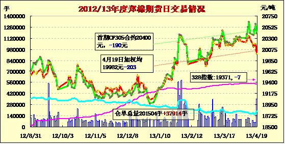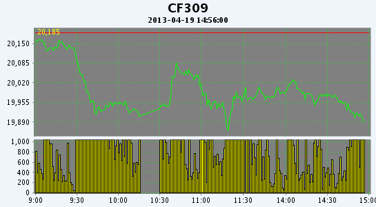 4月19日,鄭棉主要合約平開,橫向整理后增倉下跌,此后低位震蕩,終盤收弱,日線形成長陰線,日內(nèi)成交量放大,持倉量大幅增加。CF1309合約日成交324646手,日增倉37446手,終盤持倉量154934手;CF1401合約日成交22052手,日增倉2036手,終盤持倉量36106手。 基本面情況:據(jù)農(nóng)業(yè)部農(nóng)情調(diào)度,截至4月16日,全國已播農(nóng)作物22.5%,進度同比快0.7個百分點。其中,棉花已播19.4%,快4.8個百分點。當前長江流域,江蘇棉花主產(chǎn)區(qū)鹽城出現(xiàn)開春以來的高溫天氣。當?shù)刈罡邭鉁剡_到25度以上,作物明顯撥節(jié)生長,10號左右下種的缽育棉陸續(xù)出苗,早些播種的苗床已全面齊苗且在近幾天的高溫中有所伸展。而當前企業(yè)積極學習新國標。