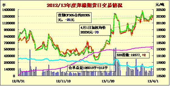 4月1日,鄭棉主要合約低開,早盤調(diào)整后低位震蕩,尾盤在多頭買盤推動下回升,日線形成低開陰線星,日內(nèi)成交量萎縮,持倉量變化不大。CF1309合約日成交87602手,日增倉584手,終盤持倉量148706手;CF1401合約日成交5192手,日減倉136手,終盤持倉量32712手。本面情況:昨日為交儲最后一日,400型棉花企業(yè)已經(jīng)基本清場停止籽棉收購工作,等待回款清算,企業(yè)正在抓緊最后的時間進行入庫。紡織企業(yè)參與儲備棉投放競拍工作較為積極,現(xiàn)貨市場較為冷清,呈現(xiàn)有價無市。下游方面,全棉紗部分品種價格波動,交易批量較前期有所增加,但整體出貨量不足。