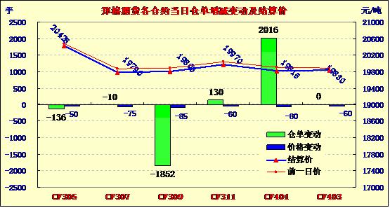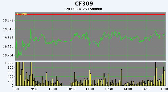 4月25日,鄭棉主要合約小幅低開,早盤下探后在空頭回補(bǔ)支撐下反彈,此后窄幅盤整,日線形成星線,日內(nèi)成交量變化不大,持倉量近減遠(yuǎn)增。CF1309合約日成交62982手,日減倉1852手,終盤持倉量146916手;CF1401合約日成交11624手,日增倉2016手,終盤持倉量38304手?;久媲闆r:紡織企業(yè)主要精力放在購買國儲棉方面,市場現(xiàn)貨成交稀少。在公路、鐵路都有補(bǔ)貼的基礎(chǔ)上,紡企購買新疆庫棉花后,首先爭取鐵路運(yùn)輸,其次選擇公路運(yùn)輸。上周鐵路運(yùn)量上升,日裝車達(dá)到300車左右。今年到新疆包廠的企業(yè)增多,承包費(fèi)也有所上調(diào),并且新國標(biāo)實(shí)施的第一年,不確定費(fèi)用增加,對棉企形成挑戰(zhàn)。近期棉企交儲完畢,普遍進(jìn)入新國標(biāo)學(xué)習(xí)階段,為新年度順利交儲做準(zhǔn)備。
