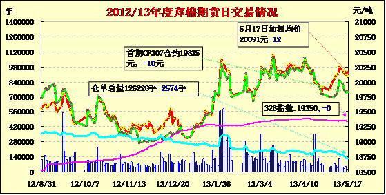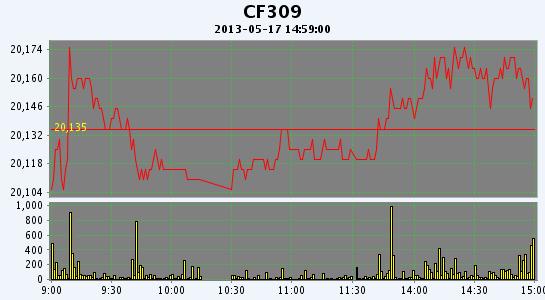 5月17日,鄭棉主要合約小幅高開,盤中區(qū)間震蕩,尾盤在多頭平倉的壓力下震蕩下滑,日線形成陰線,日內成交量萎縮,持倉量減少。CF1309合約日成交19602手,日減倉8986手,終盤持倉量77768手;CF1401合約日成交3300手,日減倉318手,終盤持倉量44222手?;久媲闆r:國內棉花現(xiàn)貨市場成交清淡,大型紡織企業(yè)資金寬裕的競拍儲備棉,而中小紡企多隨用隨買,棉價繼續(xù)持穩(wěn)。新疆阿瓦提縣昨晚突遭冰雹強降雨襲擊,城市街道被淹,農(nóng)村棉田受災嚴重。阿瓦提縣是新疆著名的長絨棉之鄉(xiāng),由于當?shù)孛尢镎幱谏L關鍵期,棉花幼苗遭受影響較大,當前受災具體面積還在進一步的統(tǒng)計中。阿瓦提縣多浪鄉(xiāng)黨委副書記張國勝介紹,現(xiàn)在這樣情況棉苗已經(jīng)都不行了,只有毀掉重新播種。另外,棉副產(chǎn)品價格穩(wěn)中有漲,由于外圍行情仍不穩(wěn)定,棉副后期走勢暫不明朗。目前棉籽存量已經(jīng)較為稀少,棉企存籽整體質量偏差,但報價堅挺。