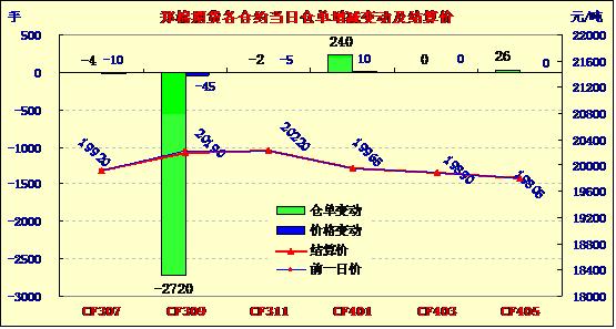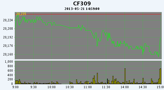5月21日,鄭棉主要合約平開,盤中在多頭平倉盤壓制下走低,尾盤受到空頭回補推動迅速反抽,日內(nèi)成交量萎縮,持倉量近減遠增。CF1309合約日成交13210手,日減倉2720手,終盤持倉量72766手;CF1401合約日成交3496手,日增倉240手,終盤持倉量44984手?;久媲闆r:全國大部棉區(qū)天氣良好,適宜棉田工作。據(jù)悉,安徽地區(qū)需要等油菜收割結(jié)束,再進行棉苗移栽;江蘇部分棉農(nóng)已經(jīng)開始移栽,但等大部移栽還得等麥收結(jié)束;山東部分地區(qū)棉農(nóng)則正忙于定苗、補苗。 棉副方面,各產(chǎn)品整體保持穩(wěn)定,棉籽貨源雖然稀少,國內(nèi)油廠對進口棉子積極性不高,主要是因為進口棉籽弊端較多。