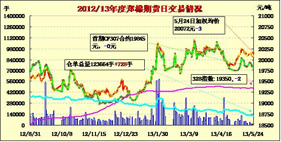 5月24日,鄭棉主要合約低開,盤中橫向盤整,CF1309合約日線形成小陰線,CF1401合約日線形成星線,日內(nèi)成交量變化不大,持倉量近減遠(yuǎn)增。CF1309合約日成交8018手,日減倉1946手,終盤持倉量71100手;CF1401合約日成交3850手,日增倉1190手,終盤持倉量45778手?;久媲闆r:國儲大幅增加了進(jìn)口棉的投放量,較受紡織企業(yè)歡迎。同時也對現(xiàn)貨市場外棉價格造成一定打壓,中間商均表示棉花不好賣,外棉現(xiàn)貨銷售不理想,價格出現(xiàn)下跌。長絨棉銷售差于前期,市場成交很少。不少中間商轉(zhuǎn)關(guān)注力到棉花收購加工。