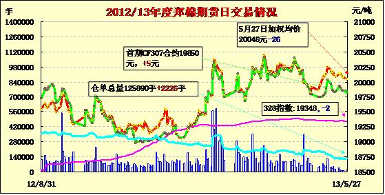5月27日,鄭棉CF1309合約沖高回落,此后盤整,CF1309合約低開下行盤整,CF1309合約日線形成小陽線星,CF1401合約日線形成小陰線,日內(nèi)成交量變化不大,持倉量近減遠(yuǎn)增。CF1309合約日成交11060手,日減倉824手,終盤持倉量70276手;CF1401合約日成交7332手,日增倉2592手,終盤持倉量48370手?;久媲闆r:國儲(chǔ)投放三萬多噸2011年度進(jìn)口棉,競(jìng)拍激烈,全部成交。進(jìn)口棉的大量投放,帶動(dòng)外盤ICE出現(xiàn)大幅下跌。據(jù)紡企反饋,主要是進(jìn)口棉質(zhì)量及重量上占有優(yōu)勢(shì),受到企業(yè)青睞。昨日再次投放三萬多噸進(jìn)口棉,從競(jìng)拍來看激烈程度較昨日略差,紡織企業(yè)已經(jīng)趨于冷靜,感受到了投放的數(shù)量之大。