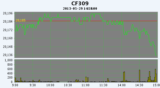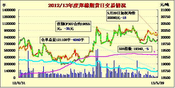 5月29日,鄭棉期貨平開震蕩,尾盤在多頭平倉的壓制下回落,日內(nèi)成交量變化不大,持倉量下滑。CF1309合約日成交8104手,日減倉3296手,終盤持倉量67010手;CF1401合約日成交3528手,日減倉778手,終盤持倉量46618手。基本面情況:國儲自投放進口棉以來,連續(xù)全部成交。進口棉質(zhì)量、重量、價格都相比優(yōu)于國產(chǎn)棉,是紡織企業(yè)偏愛的主要原因。紡織企業(yè)多反饋,準備在七月份國儲棉投放結(jié)束前補充部分庫存,但也不準備補充太多,因為下游紗線銷售利潤一般。企業(yè)較為關(guān)心七月份過后,國家是否還會繼續(xù)投放儲備棉。
