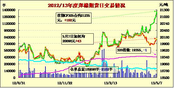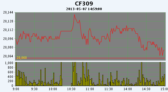 5月7日,鄭棉主要合約高開(kāi),早盤窄幅整理后上沖,午后在多頭平倉(cāng)壓力下收低,CF1309合約日線形成高開(kāi)小陰線,CF1401合約形成陰線星,日內(nèi)成交量萎縮,持倉(cāng)量近增遠(yuǎn)減。CF1309合約日成交51848手,日減倉(cāng)2300手,終盤持倉(cāng)量138656手;CF1401合約日成交3760手,日增倉(cāng)514手,終盤持倉(cāng)量37002手?;久媲闆r:在紡織企業(yè)期盼國(guó)儲(chǔ)投放進(jìn)口棉的呼聲中,今日國(guó)儲(chǔ)開(kāi)始投放2011年度進(jìn)口棉2645噸,為年度內(nèi)首次輪出。紡織企業(yè)競(jìng)買較為積極,關(guān)注度也較高。部分紡企反映還沒(méi)選到合適的捆,并且整齊度不夠好,在繼續(xù)關(guān)注。全國(guó)棉花種植預(yù)計(jì)五月中旬結(jié)束,大部分地區(qū)已出苗。進(jìn)入五月,新疆地區(qū)極端天氣有所增加,小部分棉田受災(zāi),但目前補(bǔ)苗重播還為時(shí)不晚。